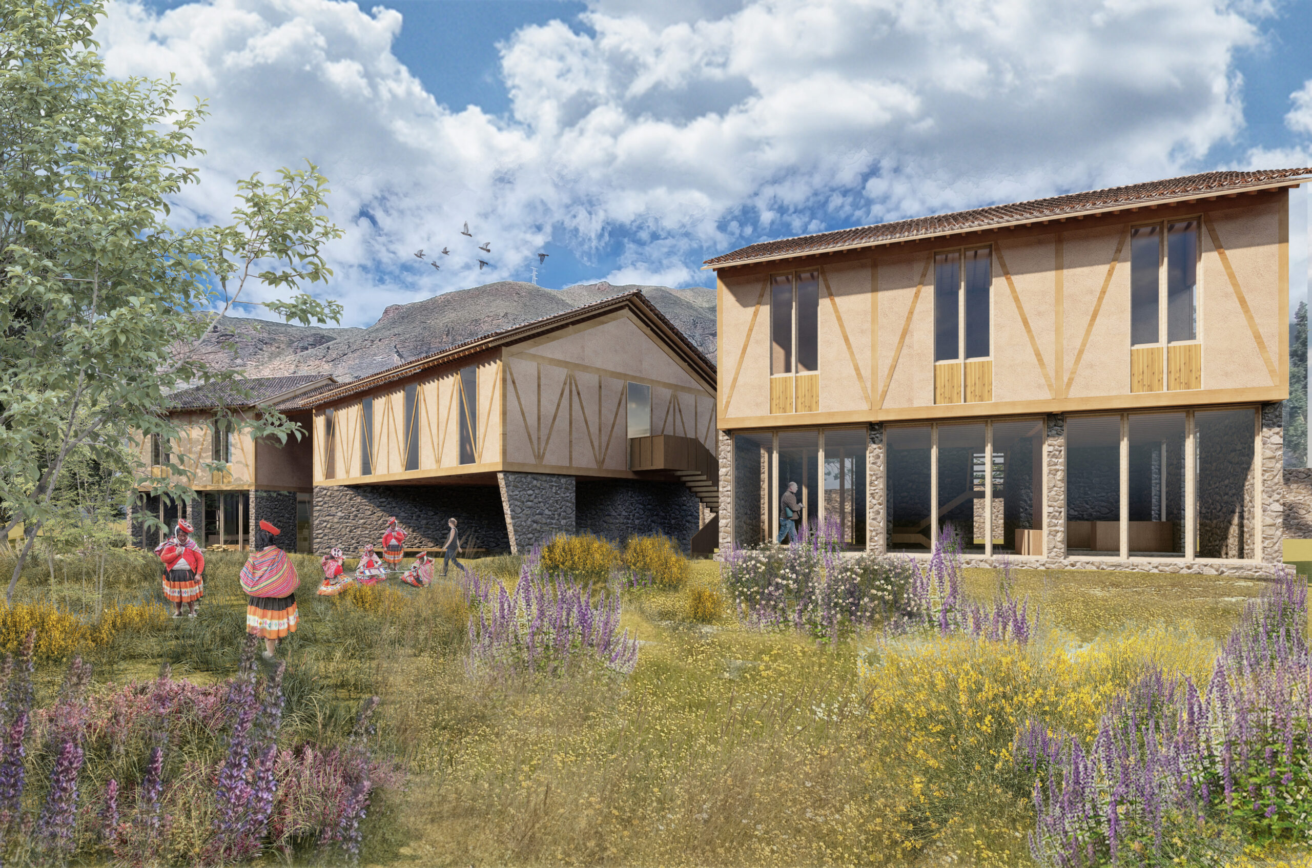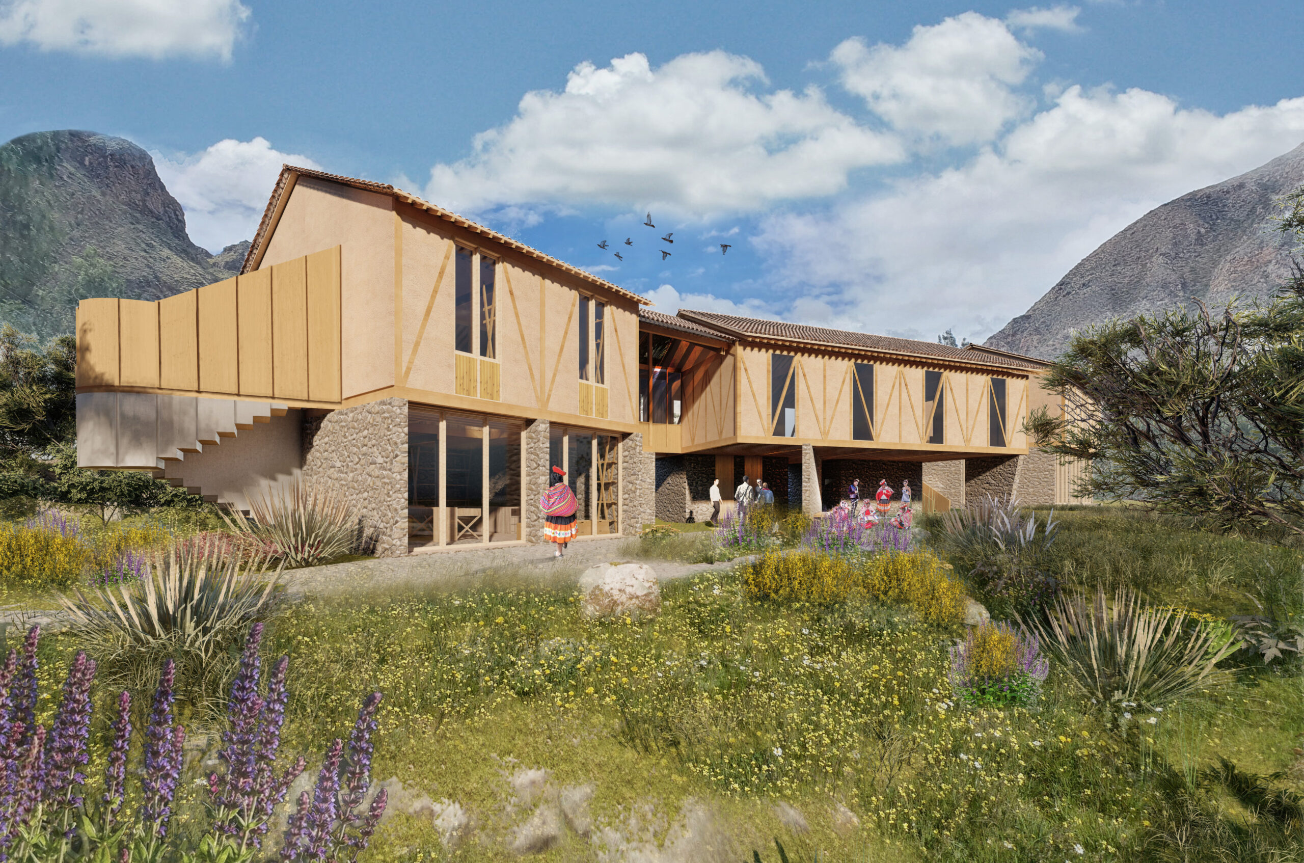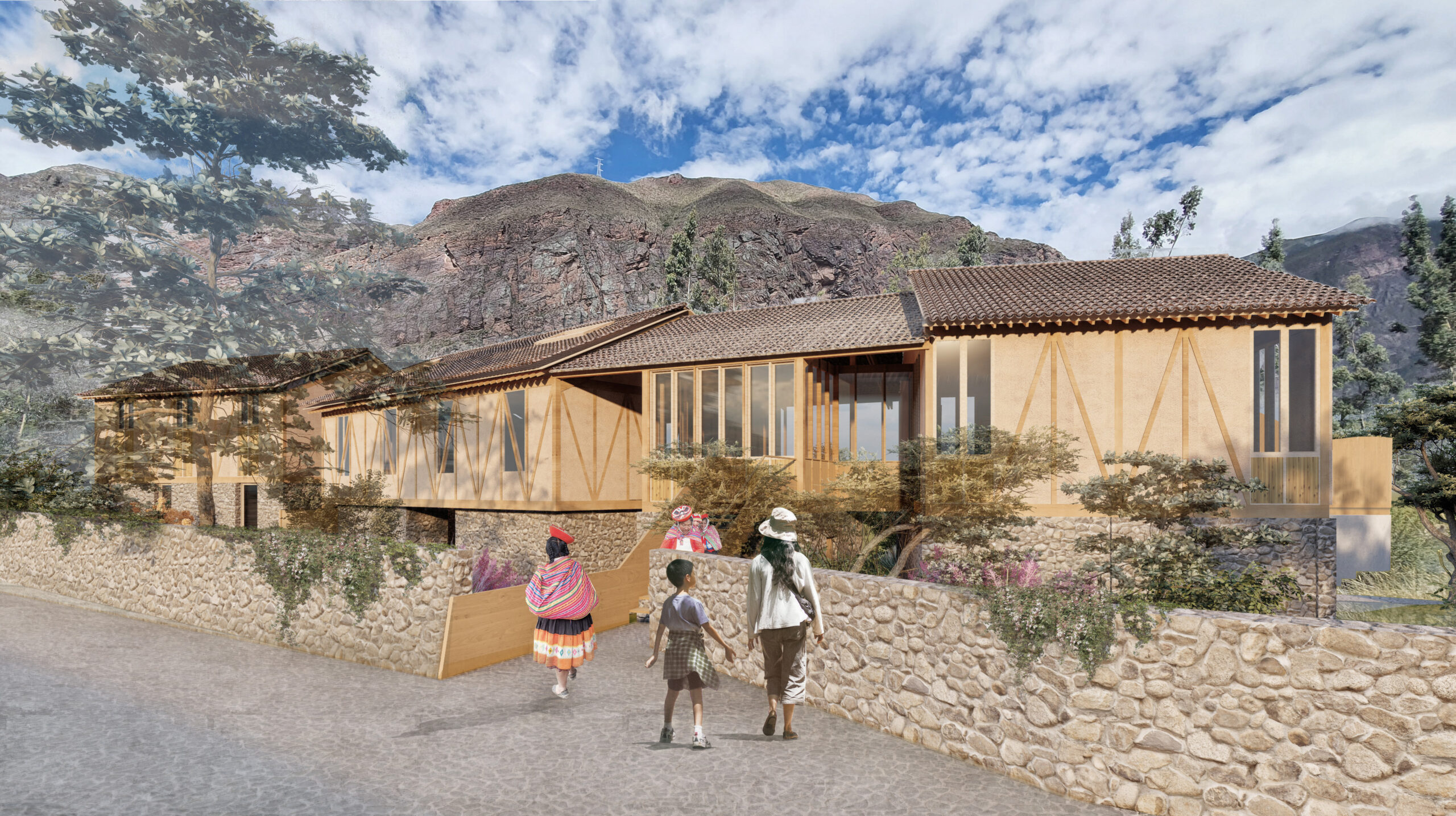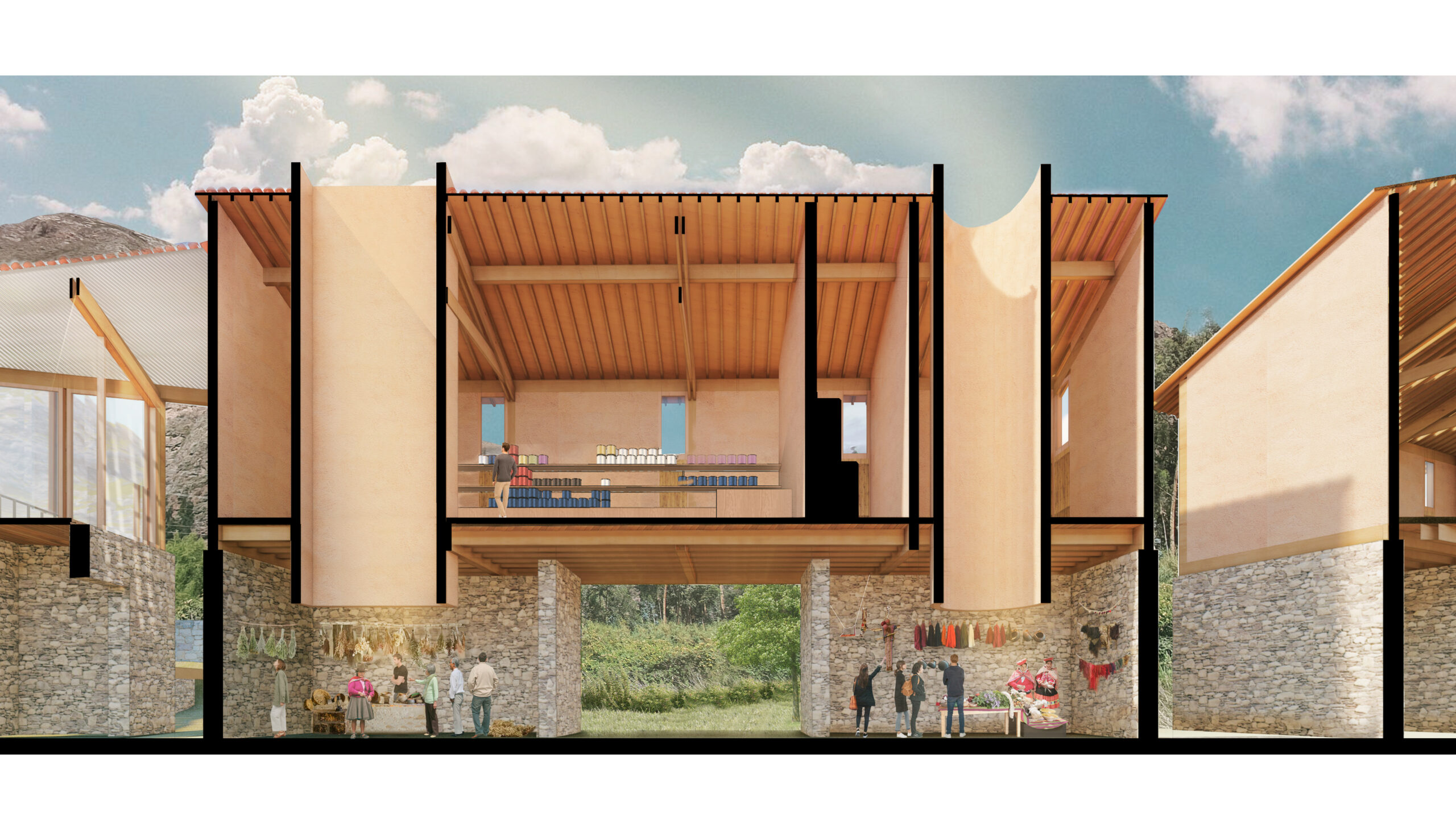 Con ese objetivo, se plantea la construcción de un centro que integre las diversas actividades productivas, formativas y de intercambio cultural que realizan. En el primer nivel se dispone un recorrido de carácter público, concebido para la demostración de saberes tradicionales vinculados al hilado, el teñido con tintes naturales y el tejido. El programa se organiza en tres ambientes articulados entre sí, con iluminación cenital natural, en relación directa con el río y con espacios flexibles que permiten la realización de talleres y exposiciones.