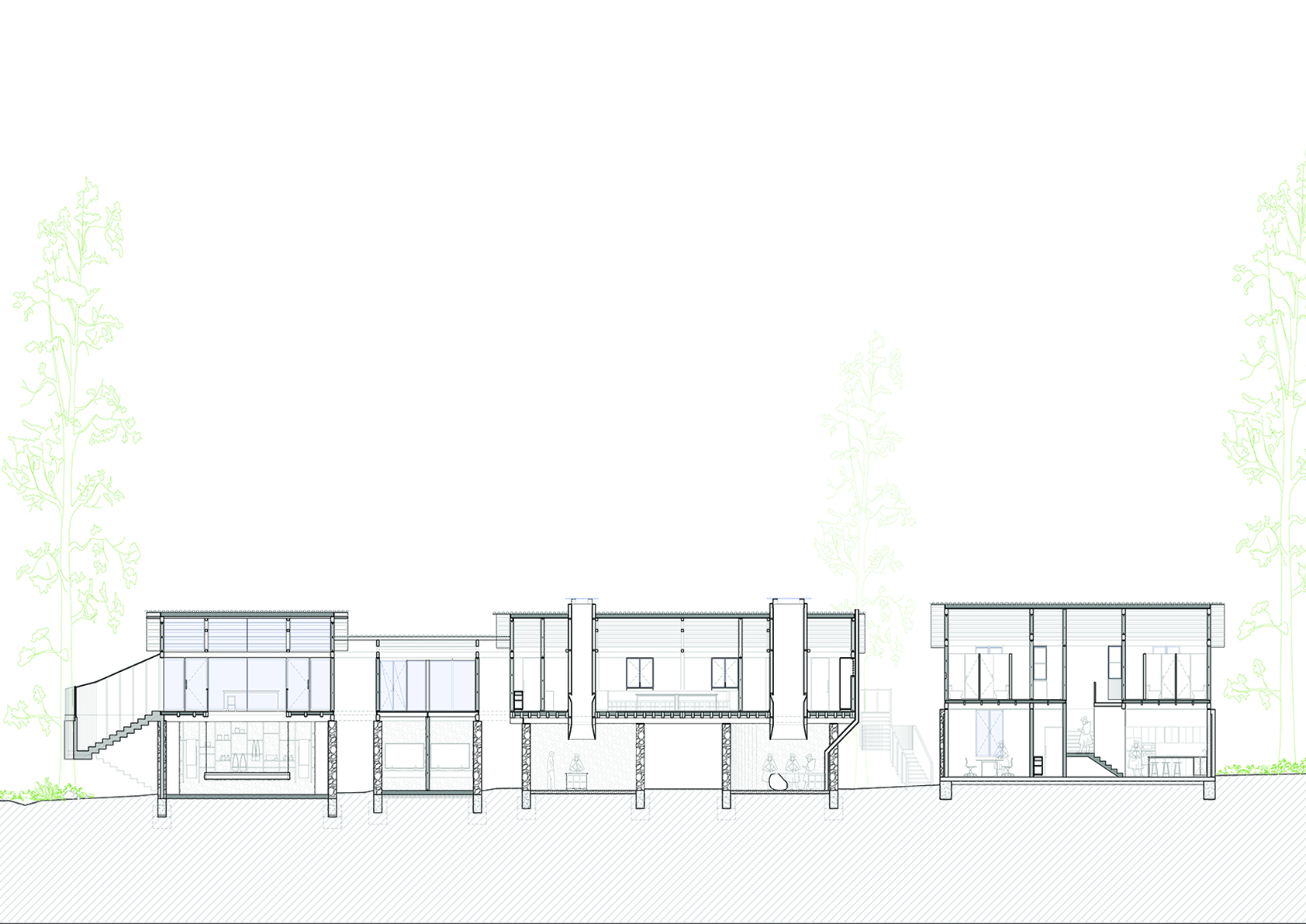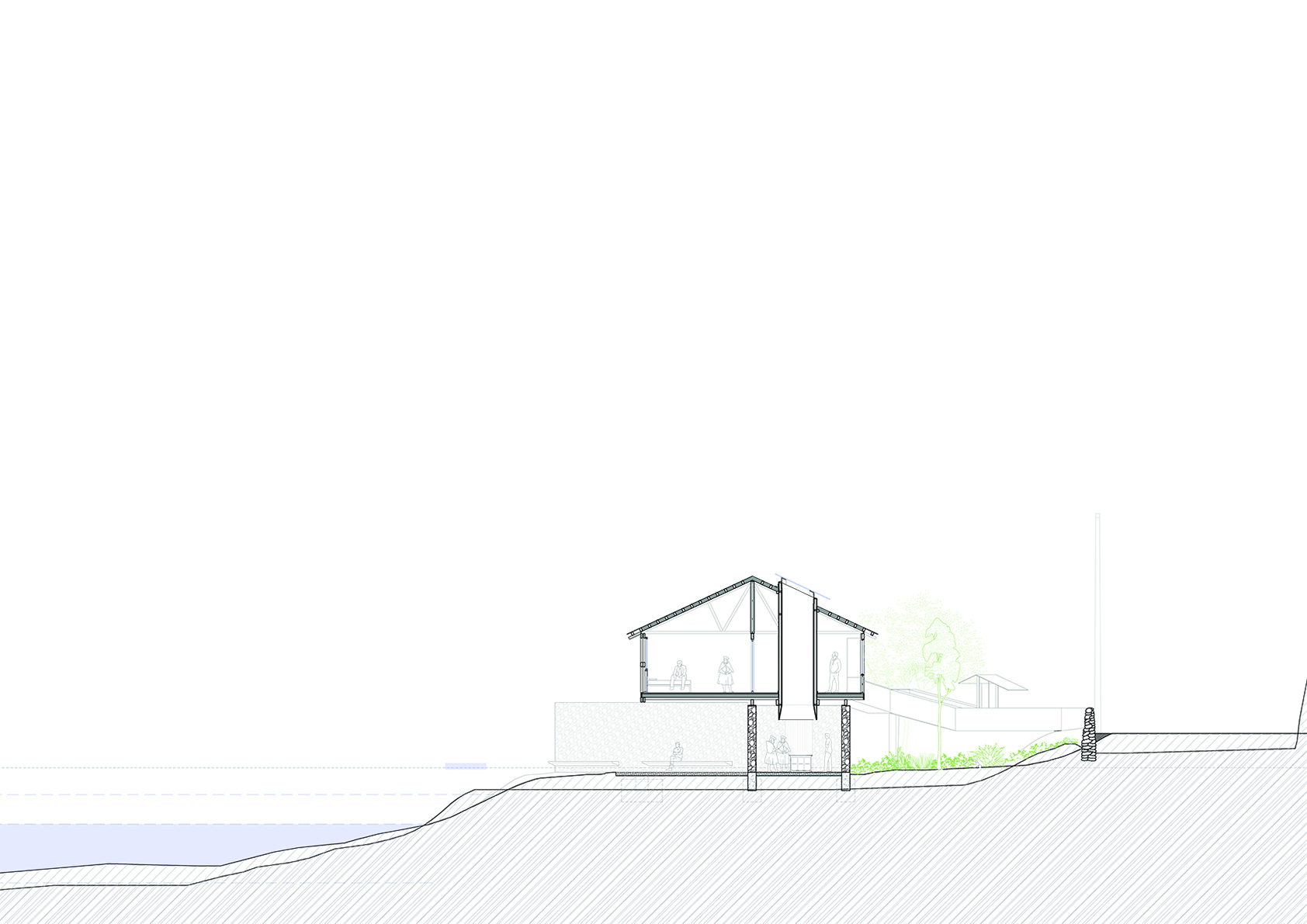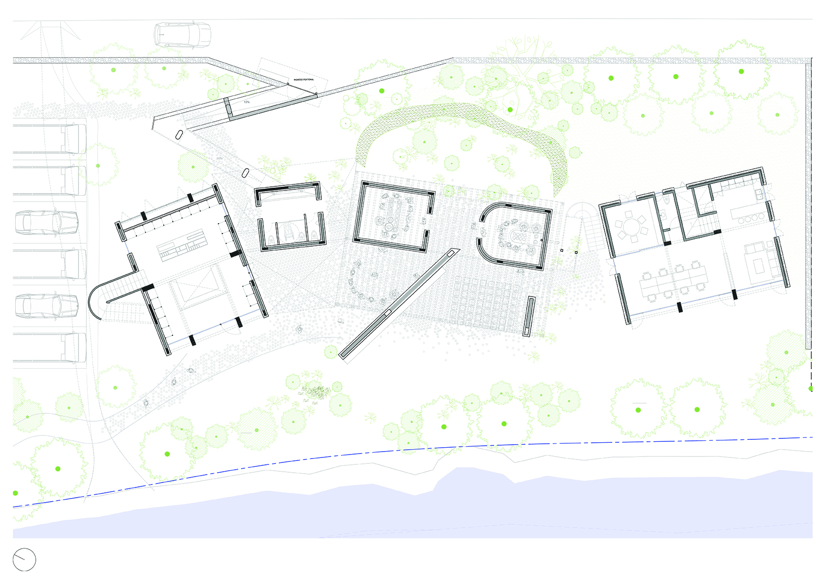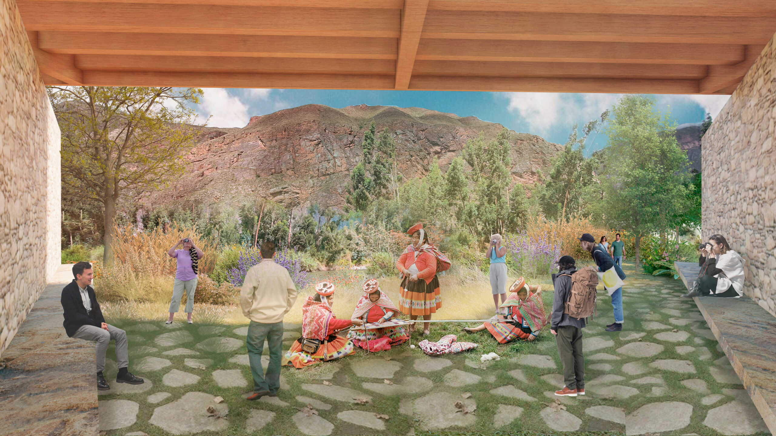 Con ese objetivo, se plantea la construcción de un centro que integre las diversas actividades productivas, formativas y de intercambio cultural que realizan. En el primer nivel se dispone un recorrido de carácter público, concebido para la demostración de saberes tradicionales vinculados al hilado, el teñido con tintes naturales y el tejido. El programa se organiza en tres ambientes articulados entre sí, con iluminación cenital natural, en relación directa con el río y con espacios flexibles que permiten la realización de talleres y exposiciones.