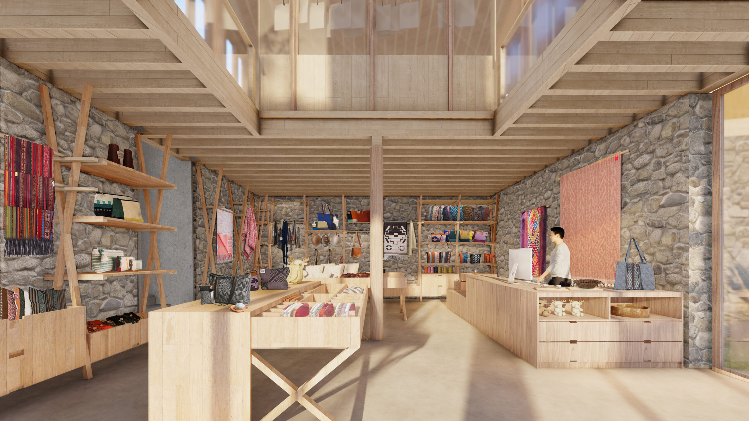 Como espacio complementario y punto de inicio del recorrido, se ubica una tienda conectada visual y espacialmente con el segundo nivel mediante una doble altura. En este nivel superior se localiza el taller de producción, donde se elaboran accesorios utilitarios a partir de los tejidos proporcionados por las artesanas. En el segundo nivel encontramos también las oficinas principales de la organización, el almacén principal y ambientes flexibles para hospedaje temporal.