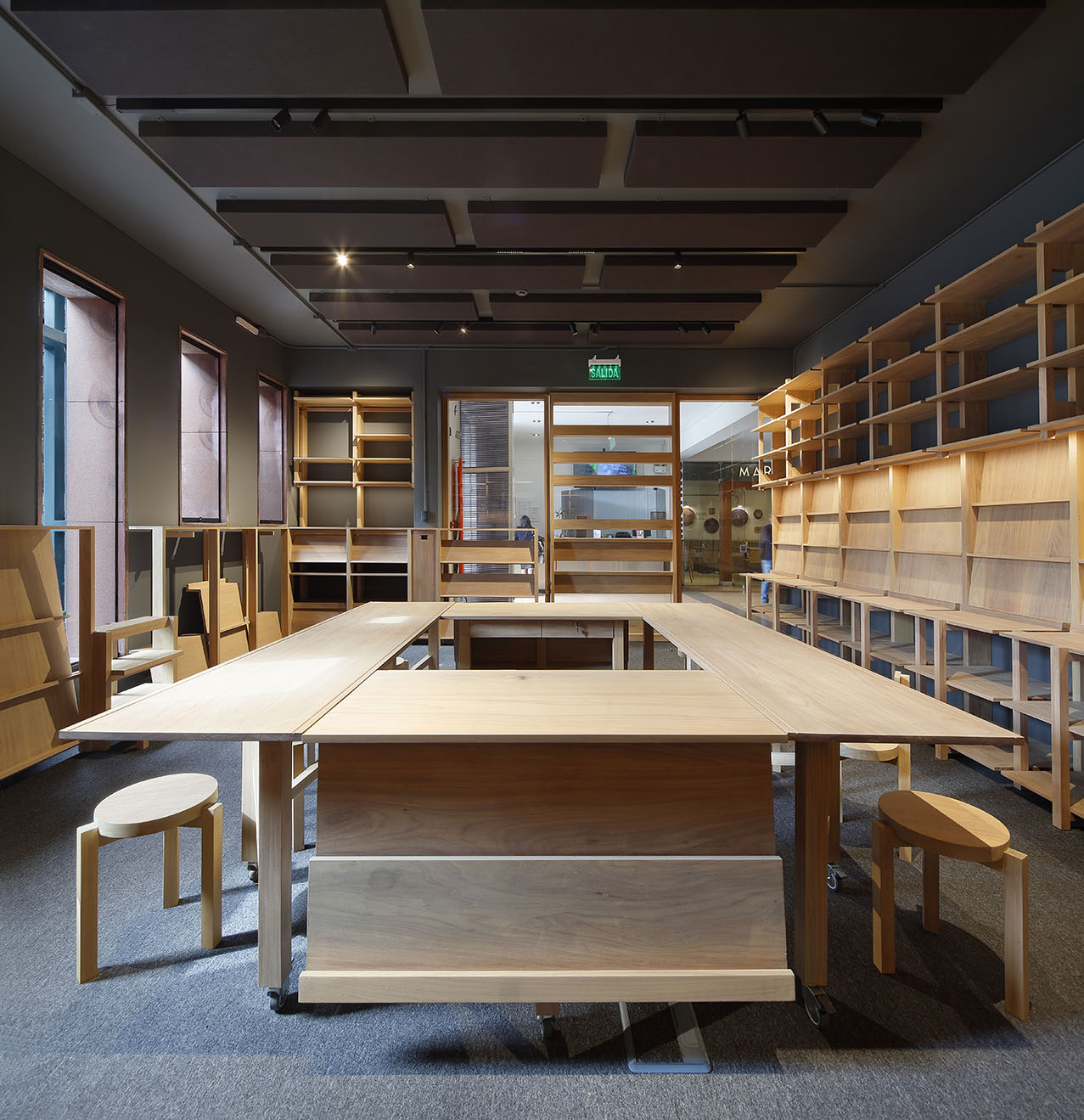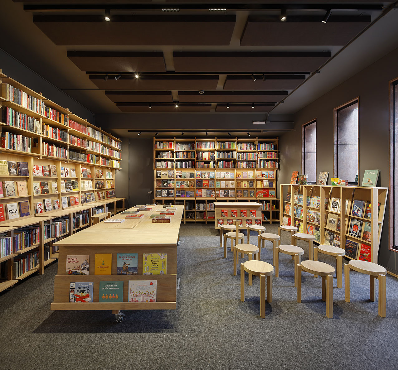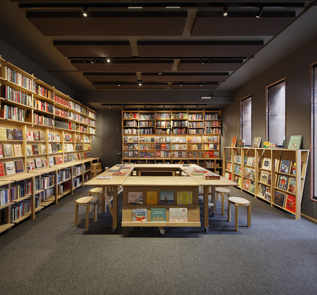 La propuesta interior organiza el espacio en torno a una gran mesa central compuesta por cuatro elementos: dos mesas grandes con bancas destinadas a la consulta de libros y dos mesas adicionales para la atención en caja. Esta disposición favorece un diálogo cercano entre los clientes y el librero en torno a los libros de interés. Los elementos que conforman la mesa central son modulares y cuentan con ruedas, lo que permite transformar y adaptar el espacio con facilidad para actividades como presentaciones de libros, cuentacuentos para niños o lecturas grupales.