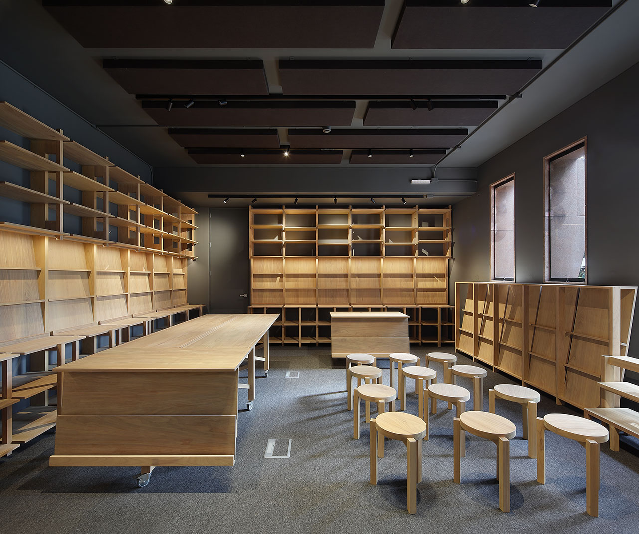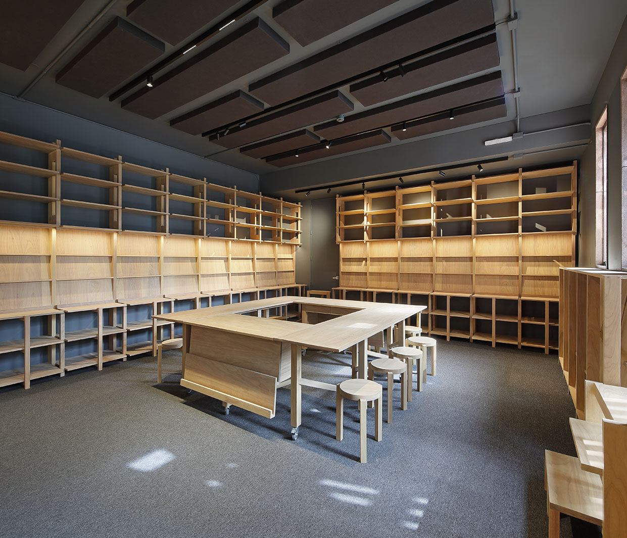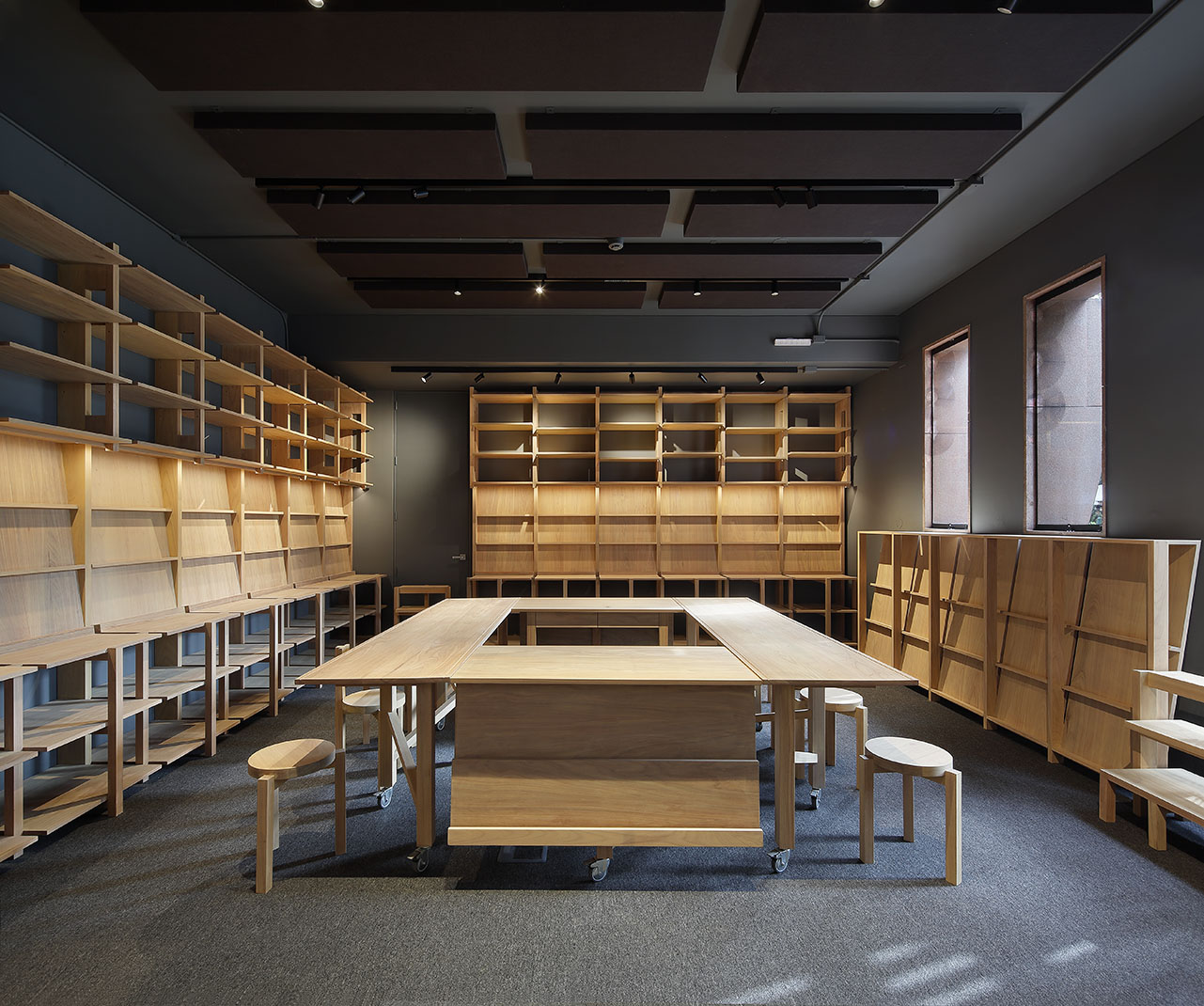 La propuesta interior organiza el espacio en torno a una gran mesa central compuesta por cuatro elementos: dos mesas grandes con bancas destinadas a la consulta de libros y dos mesas adicionales para la atención en caja. Esta disposición favorece un diálogo cercano entre los clientes y el librero en torno a los libros de interés. Los elementos que conforman la mesa central son modulares y cuentan con ruedas, lo que permite transformar y adaptar el espacio con facilidad para actividades como presentaciones de libros, cuentacuentos para niños o lecturas grupales.
