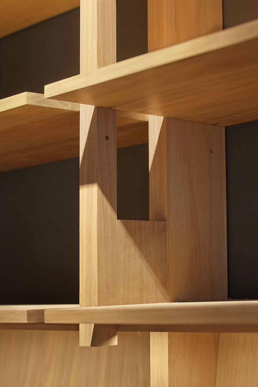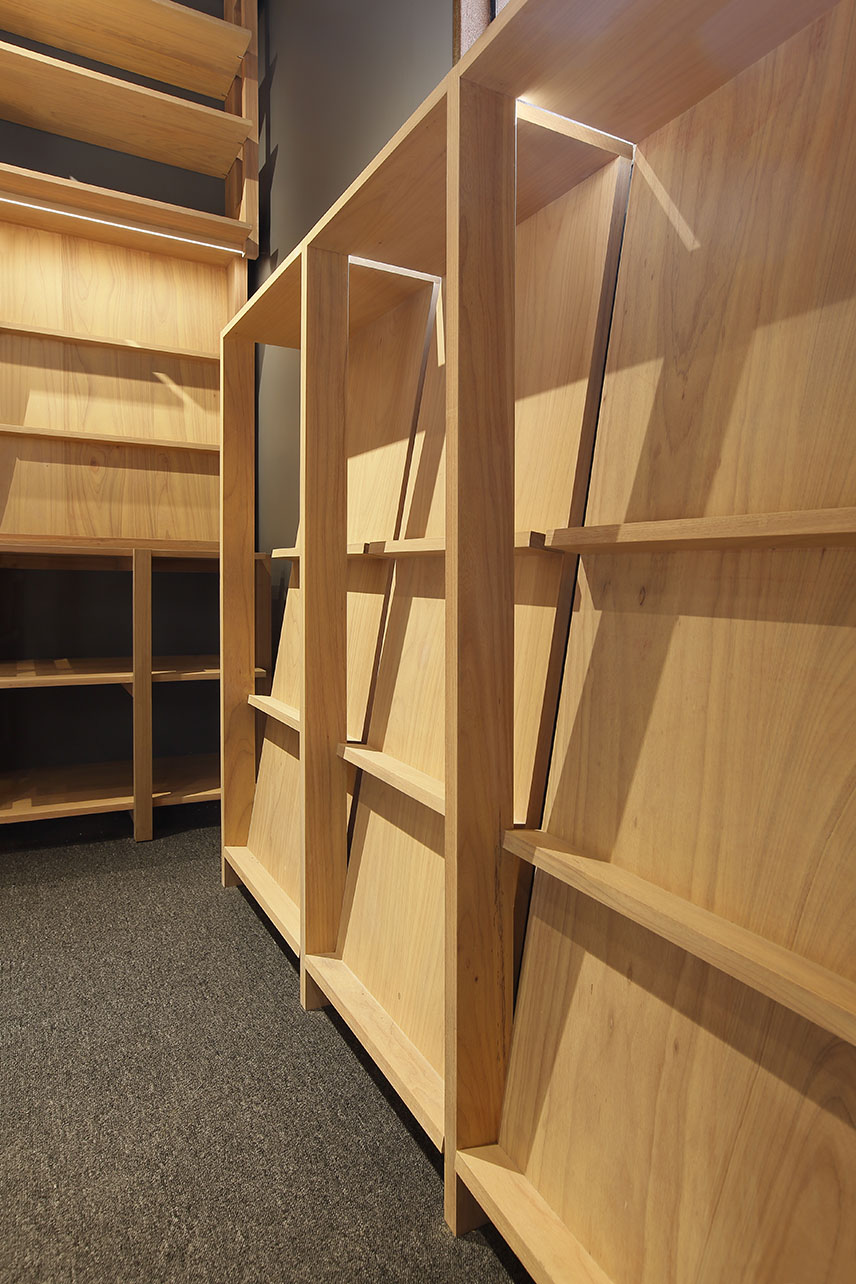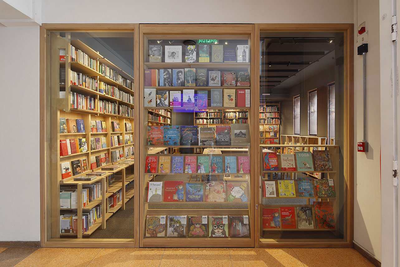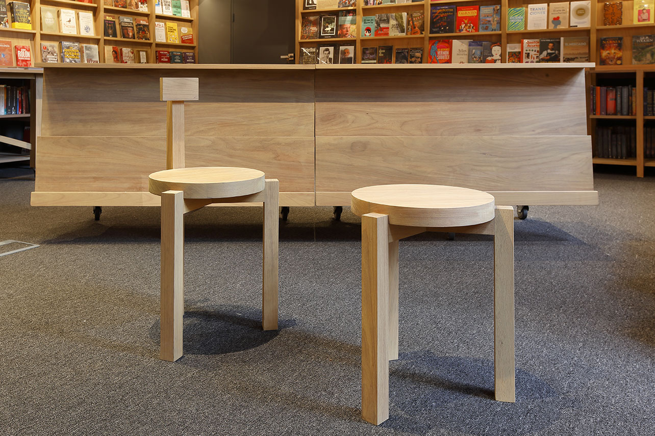 Alrededor de esta mesa central, se organizan diferentes diseños de estanterías modulares que priorizan la vista de libros en carátula y también se adaptan a los diferentes artículos colocados para la venta: libros, revistas, agendas, camisetas, casacas, tomatodos, etc. Las estanterías perimetrales cuentan con pines en la parte superior para poder adaptarlas a las diferentes alturas de los libros. Todos los muebles han sido construidos con piezas de madera cachimbo, ensambladas mediante un sistema de uniones simples y de fácil armado.