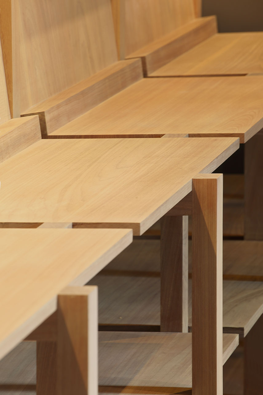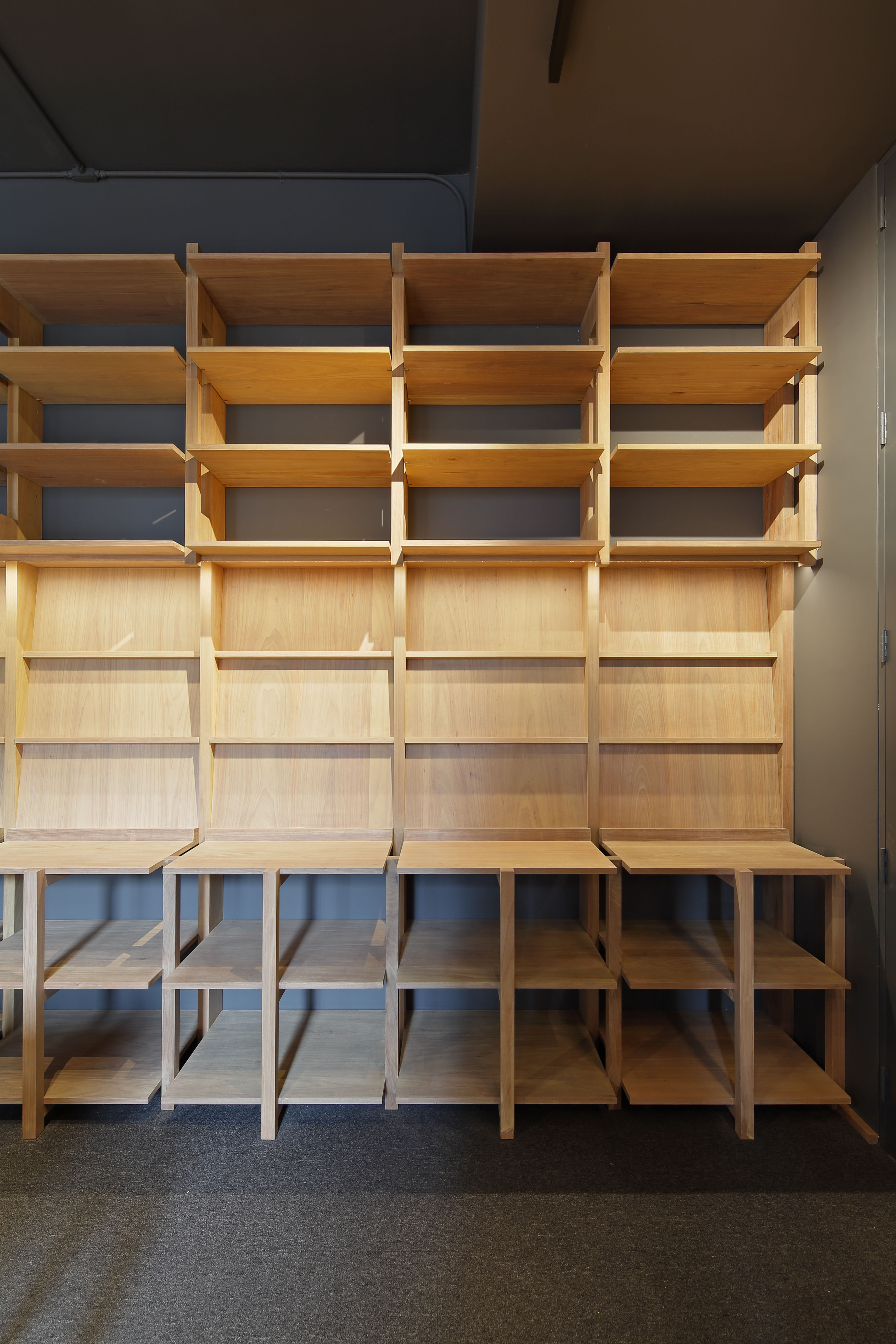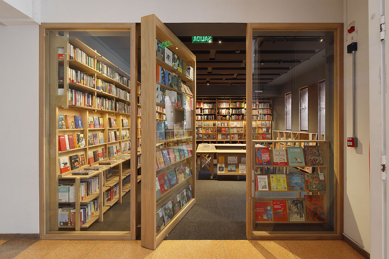 Alrededor de esta mesa central, se organizan diferentes diseños de estanterías modulares que priorizan la vista de libros en carátula y también se adaptan a los diferentes artículos colocados para la venta: libros, revistas, agendas, camisetas, casacas, tomatodos, etc. Las estanterías perimetrales cuentan con pines en la parte superior para poder adaptarlas a las diferentes alturas de los libros. Todos los muebles han sido construidos con piezas de madera cachimbo, ensambladas mediante un sistema de uniones simples y de fácil armado.